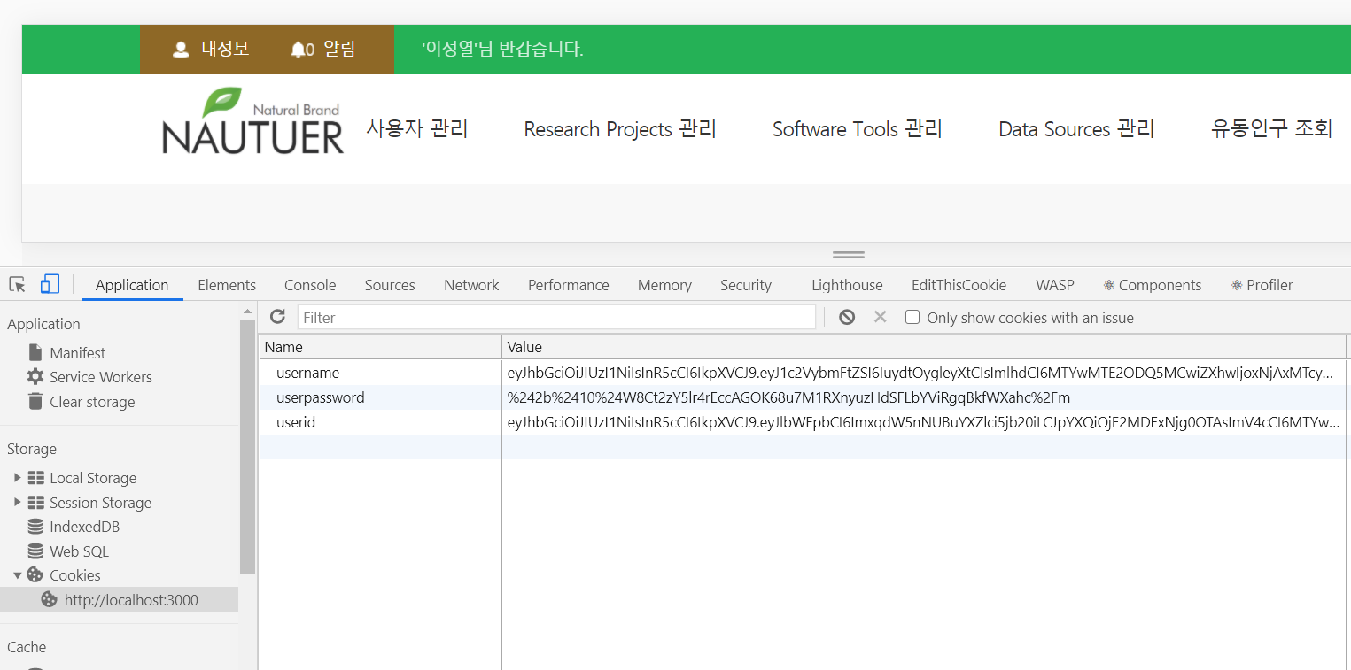 6) 로그인 완료 후, 크롬 개발자도구 > Application탭 > Storage > Cookies > http://localhost:300 순서로 클릭하면, 다음과 같이 쿠키에 jwt로 인코딩 + 암호화 처리된 회원정보가 세팅된 것을 확인할 수 있다.